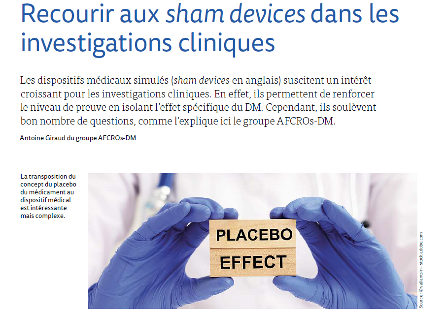 Focus sur les sham devices, un choix méthodologique clef pour les investigations cliniques des dispositifs médicaux (DM) et DM Numériques. Dans DeviceMed, Antoine Giraud de notre adhérent Horiana et expert DM pour l’AFCROs, décrypte leur essor pour isoler l'effet spécifique des DM.